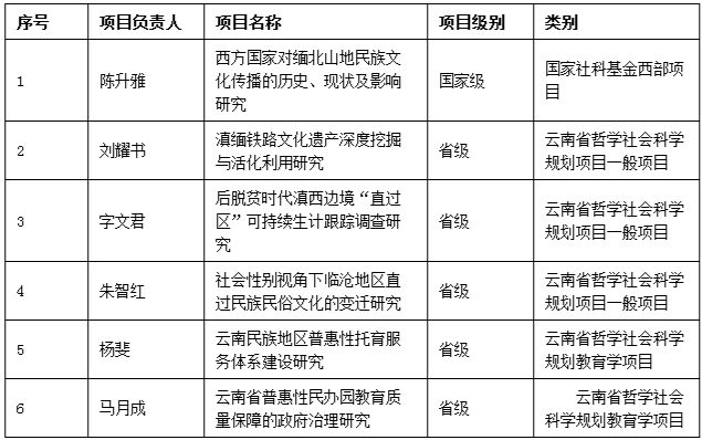 近日,上级主管部门陆续公布了国家级、省部级等高级别科研项目立项的名单。我校今年获国家社科基金项目立项1项,云南省哲学社会科学规划项目(省社科研究基地项目)立项3项,云南省哲学社会科学规划教育学项目立项2项(具体立项情况见附件)。今年获批项目涉及民族学、历史学、教育学等学科门类,高级别项目呈良好发展态势。