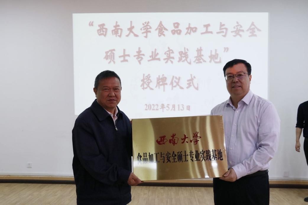 座谈会还举行了授牌仪式和聘任仪式。王进军代表西南大学授牌我校“西南大学食品加工与安全硕士专业实践基地”,并为兼职专业学位硕士研究生导师颁发聘书。董大校代表我校为西南大学谢德体教授、张宇昊教授和曾亮教授颁发特聘教授聘书。