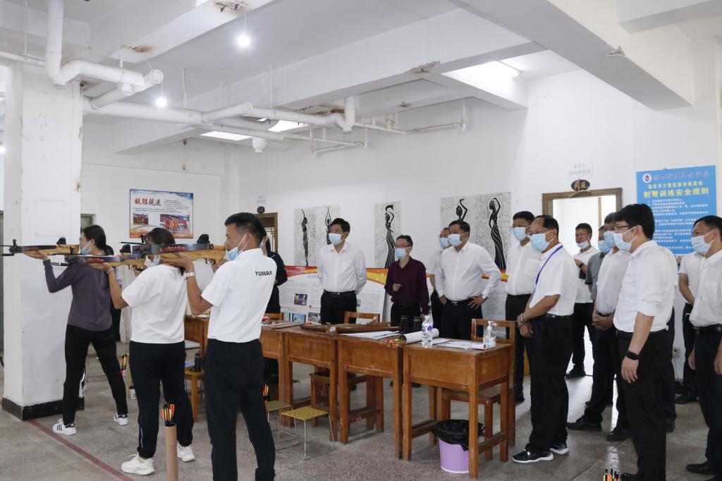 杜建辉一行查看了代表临沧市参加云南省第十二届少数民族传统体育运动会训练基地以及运动员训练情况,听取了代表队的组队、备战、训练、保障等方面情况汇报。