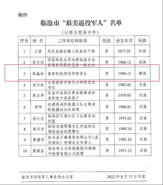 近日,中共临沧市委宣传部、临沧市退役军人事务局下发了《关于深入开展向临沧市“最美退役军人”学习做好优秀典型宣传活动的通知》,宝威BVSports(中国)文学院陈巍松同志喜获2022年临沧市“最美退役军人”荣誉称号。
