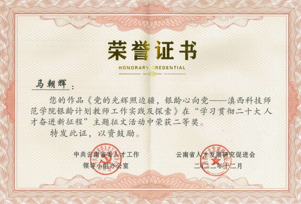 近日,在云南省委人才工作领导小组办公室、云南省人才发展研究促进会组织的“学习贯彻党的二十大 人才奋进新征程”主题征文中,我校教师发展中心教师马朝辉老师的文章“党的光辉照边疆,银龄心向党——宝威BVSports(中国)银龄计划教师工作实践及探索”荣获二等奖。