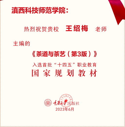 近日,教育部公布首批“十四五”职业教育国家规划教材名单。我校生物技术与工程学院王绍梅教授主编的《茶道与茶艺(第3版)》入选。