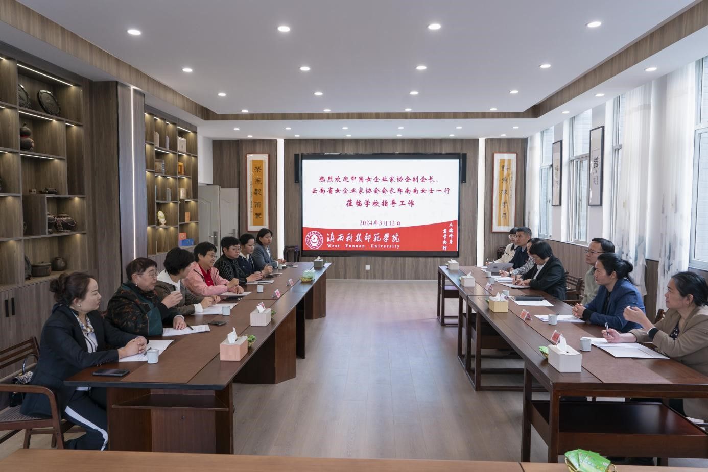 为加强校企交流与合作,搭建沟通联络平台。3月12日,中国女企业家协会副会长、云南省女企业家协会会长郑南南一行到校调研交流。校党委书记阮凤斌出席会议并讲话,校党委委员、副校长梅英陪同调研并主持会议。