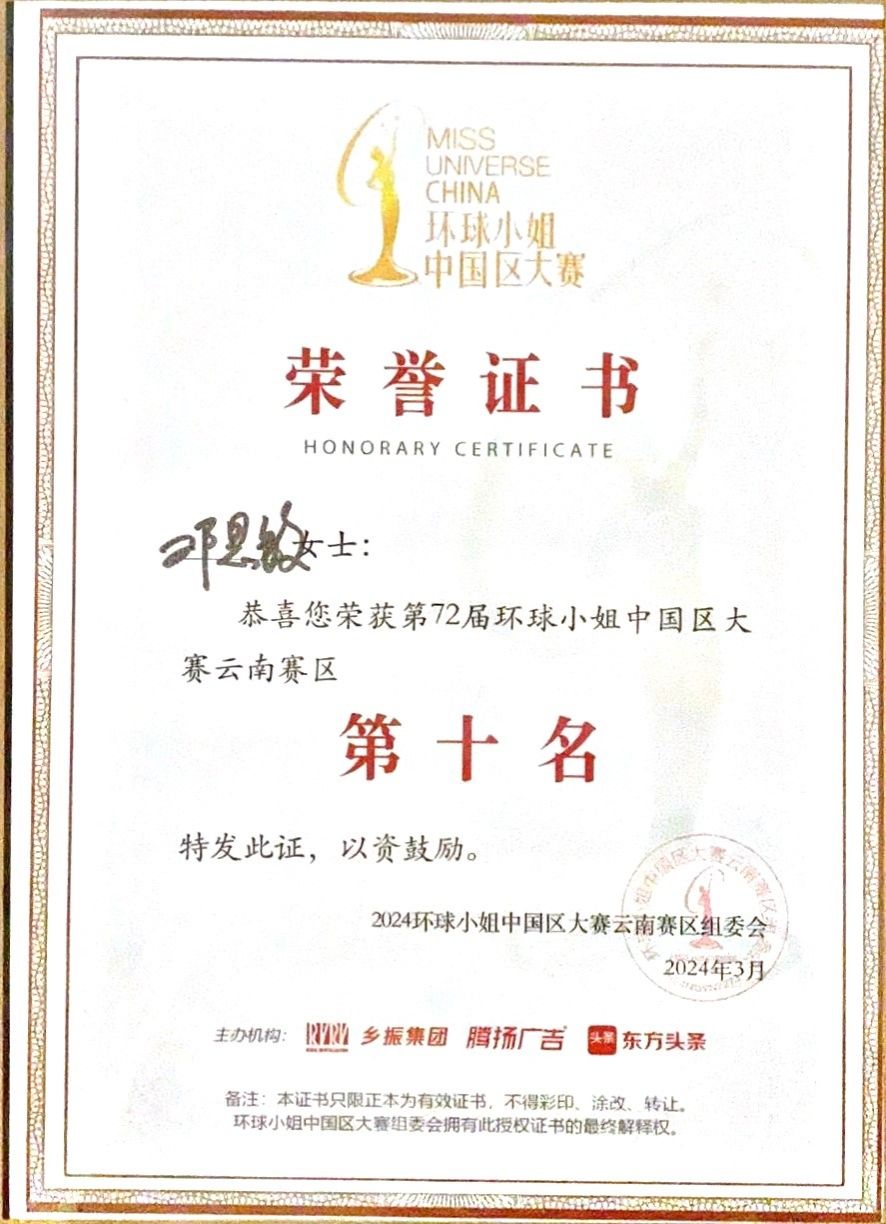 总决赛上,邓思敏同学凭借其优雅的气质和出色的表现,荣获第72届环球小姐中国区大赛云南赛区总决赛第十名,并获得代表云南赛区参加全国总决赛的资格。