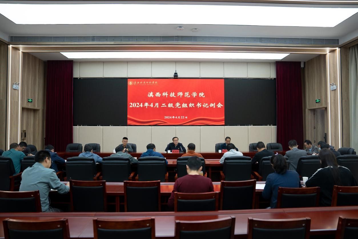4月22日,学校召开2024年度4月份二级党组织书记例会,会上传达学习了习近平总书记致云南大学建校100周年重要贺信精神、习近平总书记关于党纪学习教育的重要讲话和重要指示精神、中央党的建设工作领导小组会议精神,研究部署学校第二次党代会“两委”委员候选人的酝酿提名工作。校党委书记阮凤斌出席会议并讲话,校党委副书记施勇主持会议。