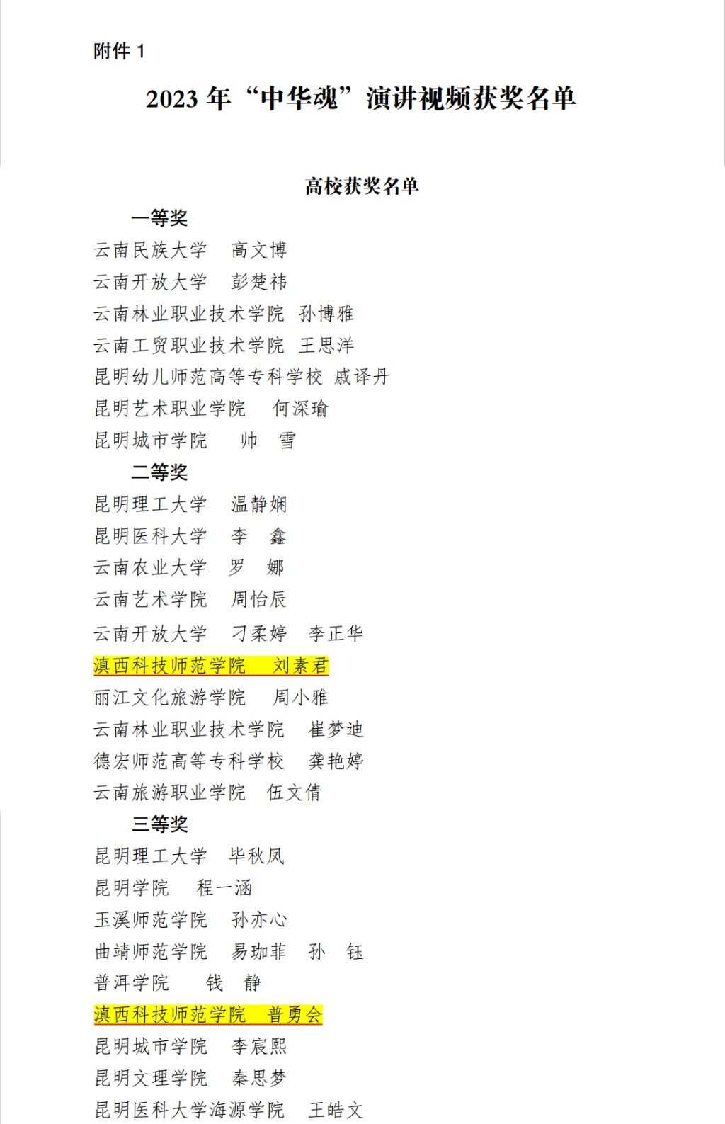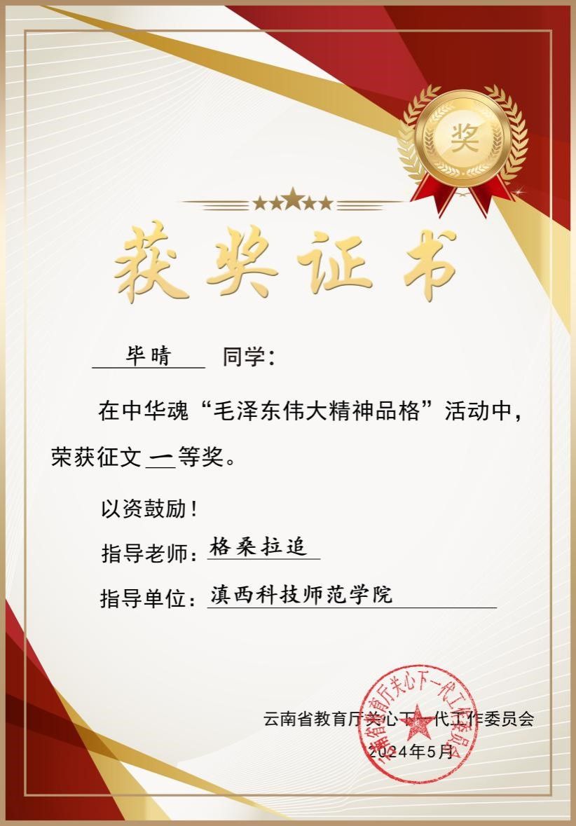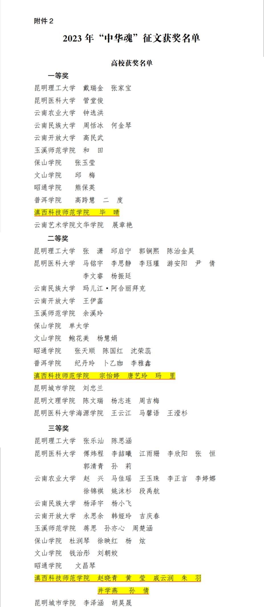 近日,云南省教育厅关工委公布2023年“中华魂”(毛泽东伟大精神品格)主题教育读书活动评选结果,我校共12名学生获奖,获得征文比赛一等奖1人,二等奖3人,三等奖6人,演讲视频比赛二等奖1人,三等奖1人。