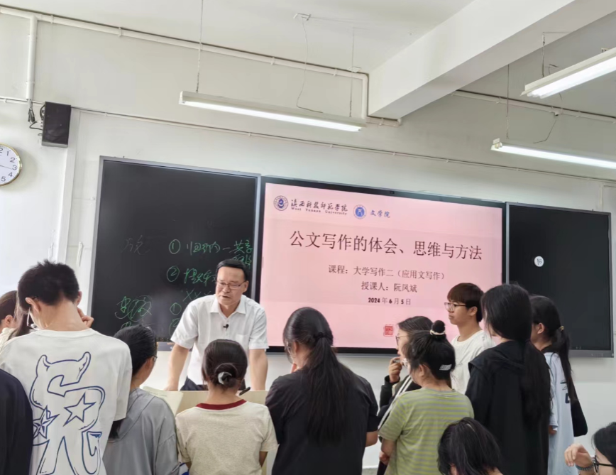 6月5日,校党委书记阮凤斌走进课堂,以“公文写作的体会、思维与方法”为题,为文学院2022级汉语言文学专业的学生讲授了一堂生动而实用的公文写作课。