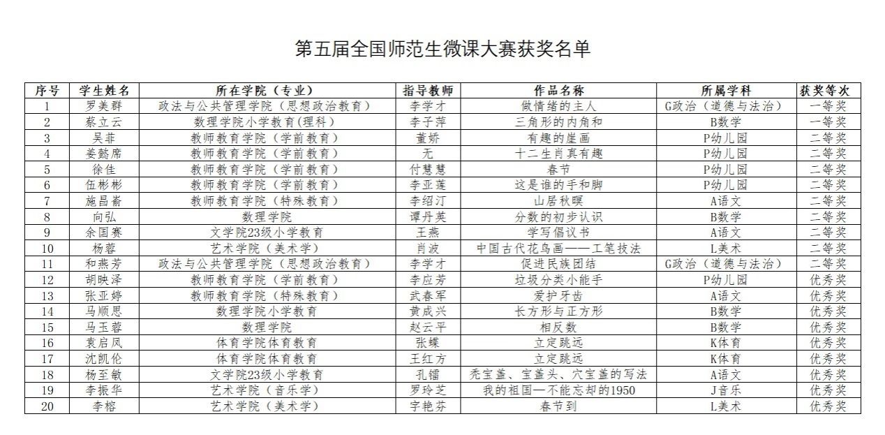 近日,第五届全国师范生微课大赛落幕,我校学子参赛的微课作品获一等奖2名、二等奖9名及优秀奖9名,充分展示了学校师范教育的实力与风采。