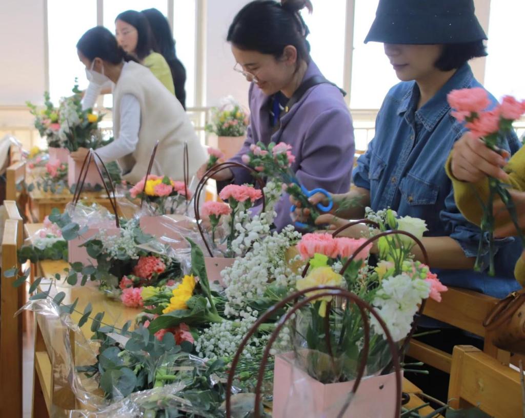 活动上,全院女教职工集体学习党的二十大精神和新修订的《中华人民共和国妇女权益保障法》。邀请花艺老师进校开展“DIY插花活动”,花艺老师用通俗易懂的语言讲解了花卉的选择、颜色的搭配、花枝长短的修剪以及如何将花卉错落有致地插满花泥等要点,并亲自指导制作花艺作品。经过一个多小时的尝试和探索,一篮篮色彩鲜艳、优雅别致的花艺作品展现在大家面前,寄托着大家对美的理解和对幸福的感悟。